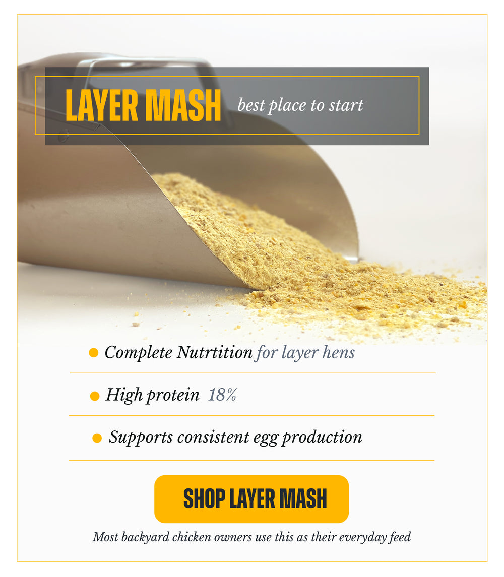 Primero está nuestro 18% Layer Mash : es un alimento completo que consta de ingredientes finamente molidos con todas las vitaminas, minerales y proteínas necesarias para producir huevos.